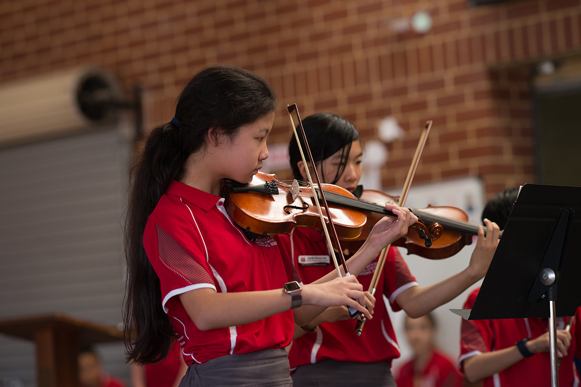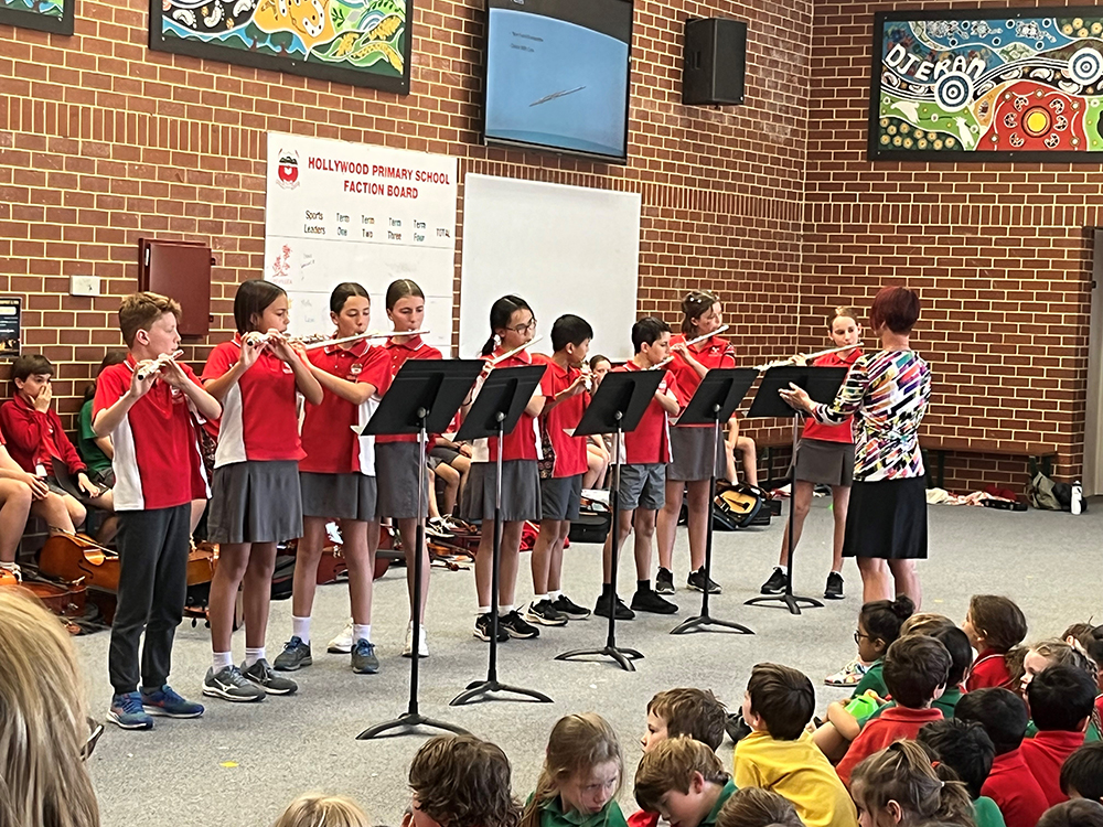 Instrumental Music School Services (IMSS) offers small group instrumental tuition to students recognised to display musical aptitude from as early as Year 3. At Hollywood the instruments offered are violin (Year 3), cello (Year 4), and guitar, flute and brass (Year 5). Instrumental music students enjoy opportunities to share their learning with their peers, including at the annual Music Assembly in Term 4.